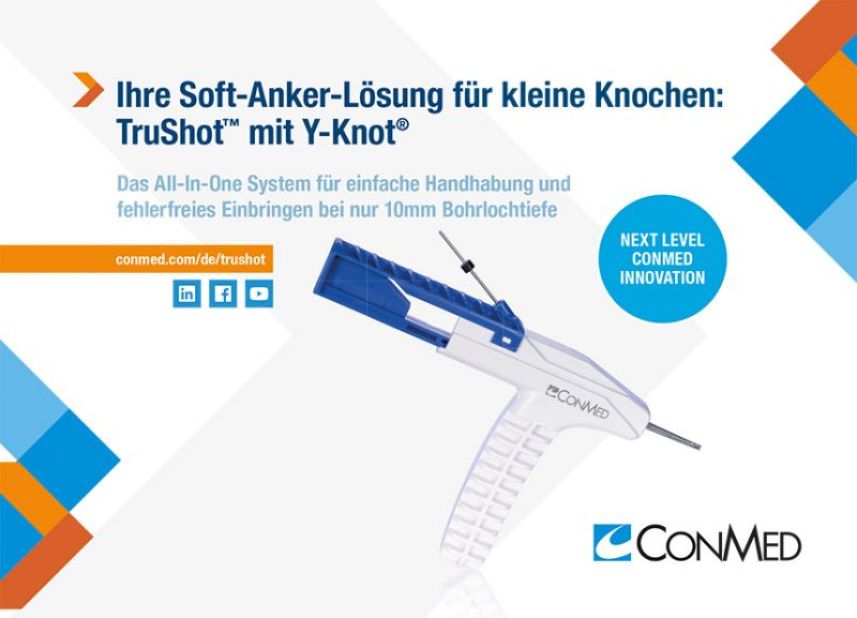 Unsere neueste Innovation im Bereich der Implantat‐Versorgung beeindruckt aktuell die medizinische Fachwelt. TruShot™ mit Y‐Knot®, speziell entwickelt für kleine Knochen wie am Fuß und im Sprunggelenk, verstärkt ab sofort die Y‐Knot Familie – unsere bewährte Soft‐Anker Serie seit 2012. Für die besonders leichte Handhabung ist dieser Anker‐Typ als All‐In‐One System konzipiert. In einem Handgriff ist die Bohrhülse mit Bohrer sowie der Soft‐Anker mit Fäden und Nadeln integriert. Mehr Informationen finden Sie hier: http://www.conmed.com/de/products/orthopedics/hand‐andwrist/fixation/trushot‐with‐y‐knot