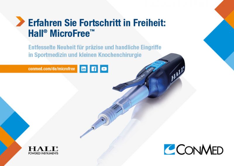 Darüber hinaus gewinnt bei den Fußchirurgen die minimalinvasive OP‐Technik in Deutschland zunehmend an Bedeutung. Dabei kommt anstelle einer Säge eine Fräse zum Einsatz. CONMED ist in diesem Bereich mit der Marke Hall® Powered Instruments seit 1963 auf dem Markt etabliert und bietet mit dem Hall® MicroPower+ System und dem neuen kabellosen Hall® MicroFree™ System fortschrittliche Lösungen speziell für die kleine Knochenchirurgie.