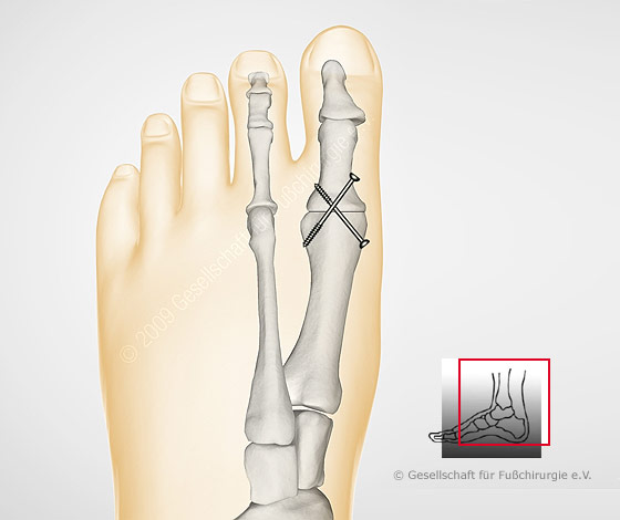 Bei der Gelenkversteifung werden die zerstörten Gelenkflächen entfernt und die benachbarten Knochen mit Schrauben, einer Platte oder mit Draht aneinanderfügt, bis sie zusammengewachsen sind. Die Schmerzen sind sicher beseitigt, eine Gelenkbeweglichkeit ist aber nicht mehr möglich.