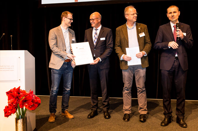 Das Forschungsstipendium der GFFC und der Firma Axomed ging 2014 an Dr. Frank Mattes (Überlingen) und Dr. Gebhard Suger (Ulm). Frank Mattes berichtete, wie mit dem Preisgeld die Entwicklung einer belastungsstabilen Osteosynthese für die minimal invasive Chevron-/Austin Osteotomie weiter vorangetrieben wurde.