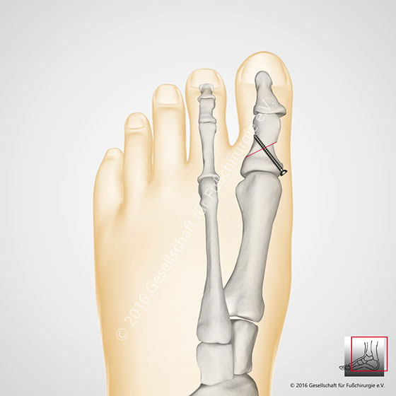 Zur Korrektur wird ein kleiner Knochenkeil aus dem Großzehengrundglied entnommen (Operation nach Akin). Damit kann die Großzehe wieder in die richtige Richtung geschwenkt werden. Zur Fixierung des durchtrennten Knochens können eine Schraube, Metallklammern, eine Drahtschlinge oder auch eine Naht des Knochens verwendet werden.