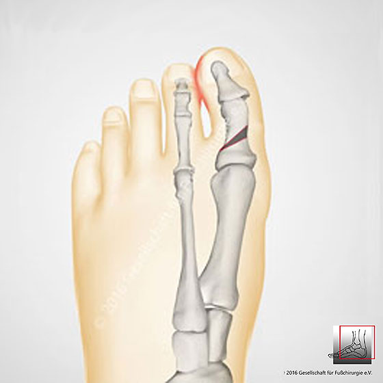 Durch eine Knickbildung der Großzehe ("Hallux valgus interphalangeus") kann es zu schmerzhaften Druckproblemen und Schwielenbildung zwischen Großzehe und der benachbarten 2.Zehe kommen.