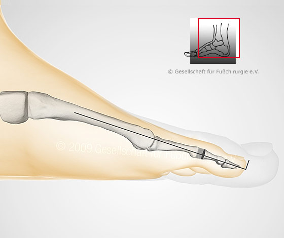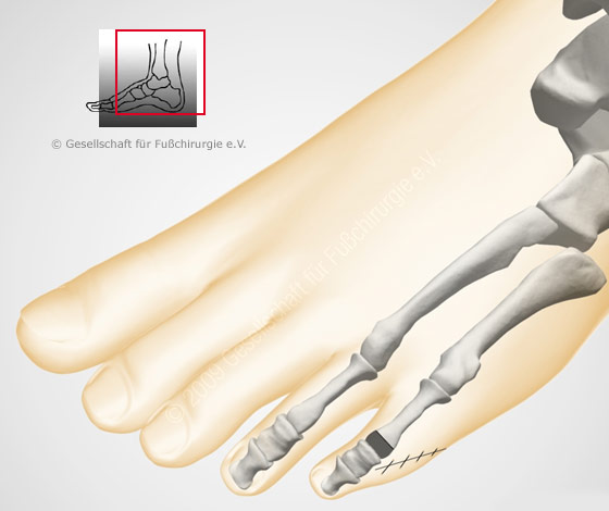 Das Köpfchen des Grundgliedes wird entfernt und die Zehe gestreckt. Das Mittelgelenk kann auch in der korrigierten Stellung versteift werden. Eine Sehnenverlagerung kann notwendig werden. Die Zehe wird vorübergehend mit einem Draht stabilisiert.